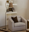 The Grasse Floor Lamp is an effortless blend of sculptural form and organic texture. Its gently curved antique brass frame feels like functional art, leading the eye up to a woven shade that casts a warm, inviting glow.