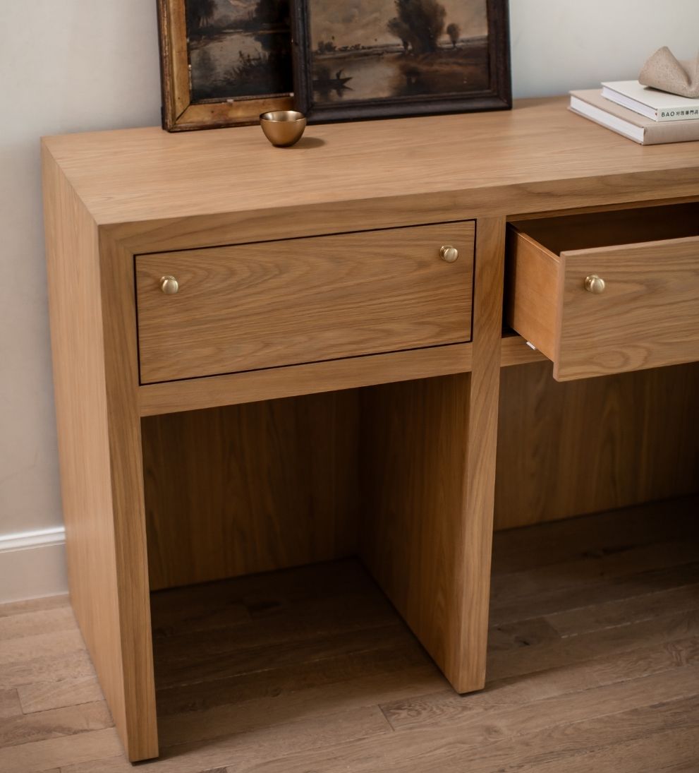 Crafted in a warm white oak finish, Clara highlights the natural movement of the wood grain, while sleek brass hardware adds just the right hint of polish. The silhouette is clean and architectural, softened by thoughtful proportions that make it feel welcoming rather than imposing.