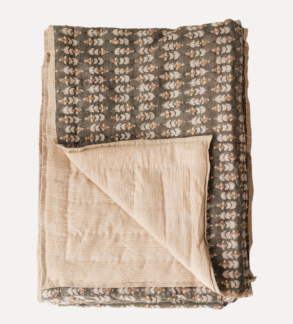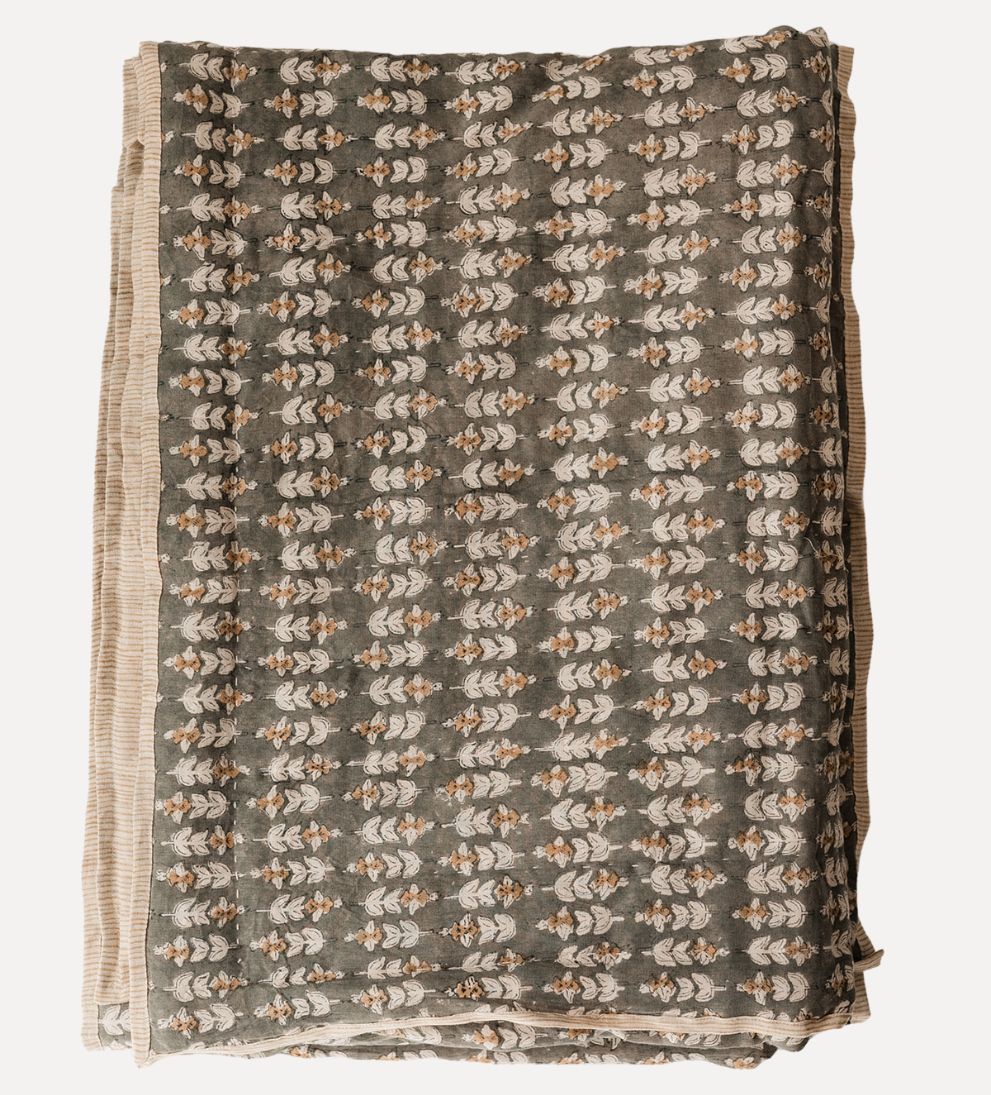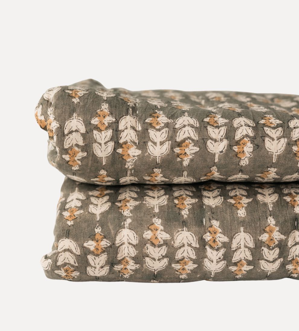 Drape your bed in the exquisite comfort of our Blossom Block Print Quilt – a harmonious fusion of style and warmth. In captivating colors Sierra, Stargazer, and Olive, this quilt features a timeless block print pattern that adds a touch of bohemian flair to your bedroom.