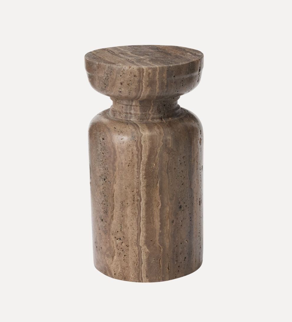 Say hello to the piece you didn’t know your space was missing. Our handmade Stone Pedestal is carved from natural travertine marble with a creamy white base and warm, earthy veining—think tan, toffee, and a whisper of caramel swirl. Each one is unique, with organic variations that make it feel like functional art.